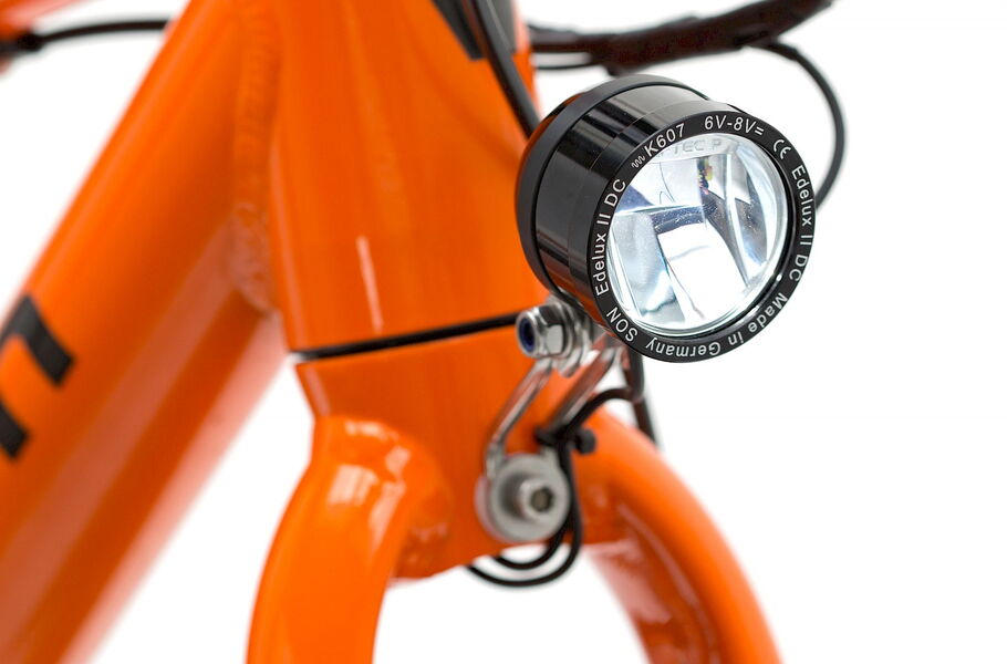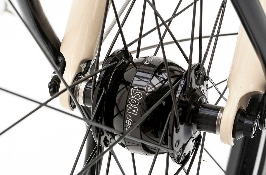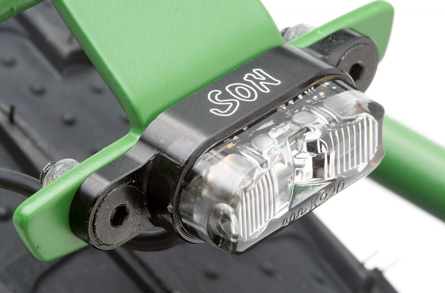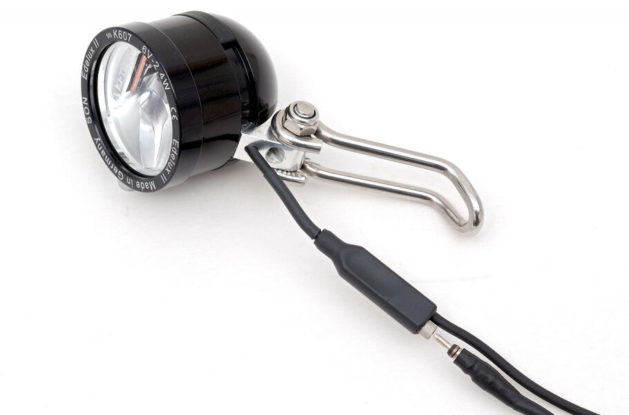 Tipp: Den SON 28 gibt es auch in »steckerloser« Ausführung, passend für die Velotraum-Direktkontakt-Gabeln A425 und A405. Hier verschwindet das Lichtkabel in der Gabelscheide, und es wird auch keine Stecker mehr zwischen Nabendynamo und Scheinwerferkabel benötigt.
