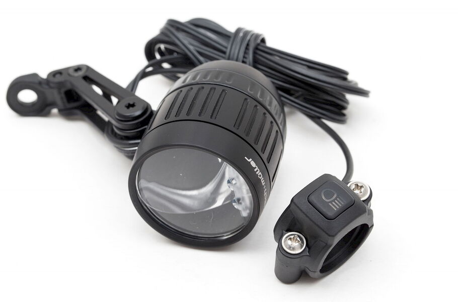 Pedelec-Scheinwerfer mit zuschaltbarem Fernlicht. Mittels Lenkerschalter kann vom 80-Lux-Abblendlicht auf 120-Lux-Fernlicht umgeschaltet werden, also Ausleuchtung nach Bedarf. Das schont den Akku und die Augen (nicht nur nachts) anderer Verkehrsteilnehmer, insbesonders auf Rad- und Landwirtschaftswegen. Lichtausbeute: 80/120 Lux. Gewicht: 140 g.