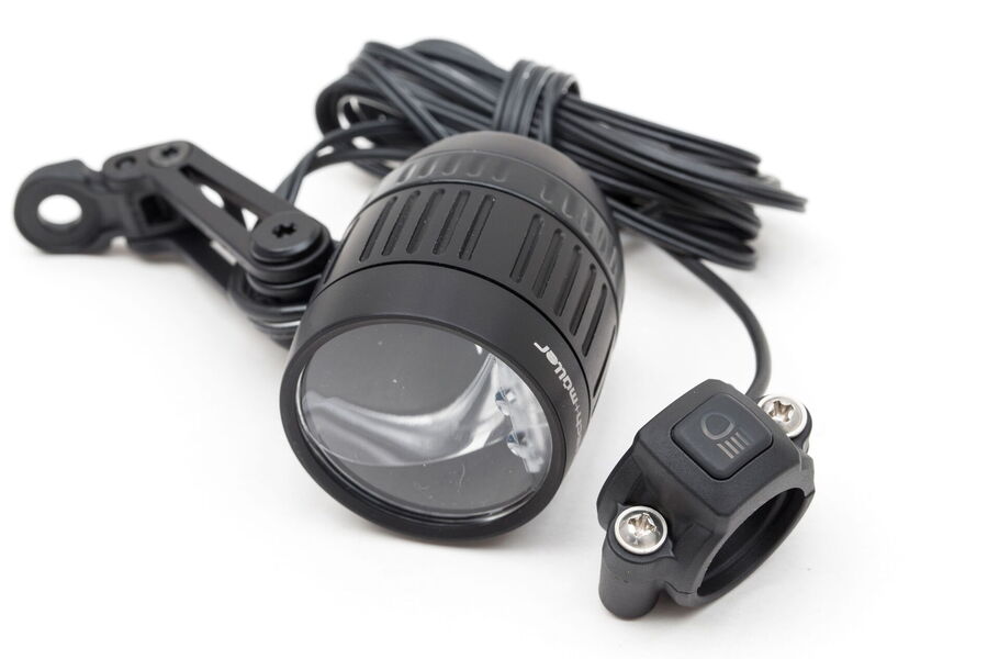 Möchtest du die ultimative Ausleuchtung für stockdunkle und kurvige Strecken am E-Bike, dann nimm noch den Kurvenlicht-Assistenten von Busch + Müller dazu. Das ist ein kugelgelagerter Adapter, der zwischen Leuchte und Halterung sitzt und der dafür sorgt, dass der Horizont immer waagerecht ausgeleuchtet bleibt. Soll noch ein Fernlicht dabei sein, empfiehlt sich der Scheinwerfer IQ-XM E von Busch + Müller, auch den haben wir im Repertoire.