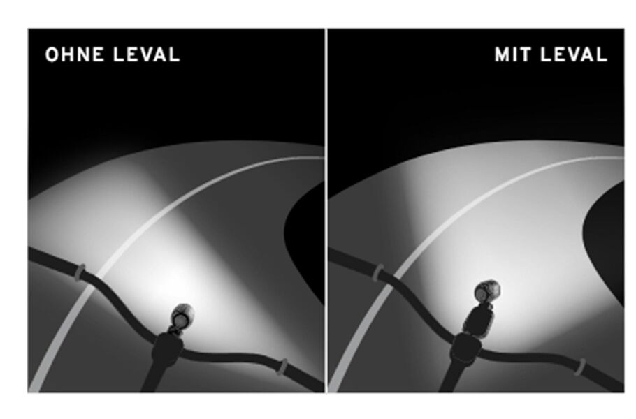 Für dieses Problem hat Busch + Müller einen adaptiven Kurvenlicht-Assistenten namens Leval entwickelt. Eine eingebaute Neigetechnik mit elektronischen Sensoren sorgt dafür, dass die Hell-Dunkel-Grenze immer waagerecht und auf gleicher Höhe gehalten wird.
