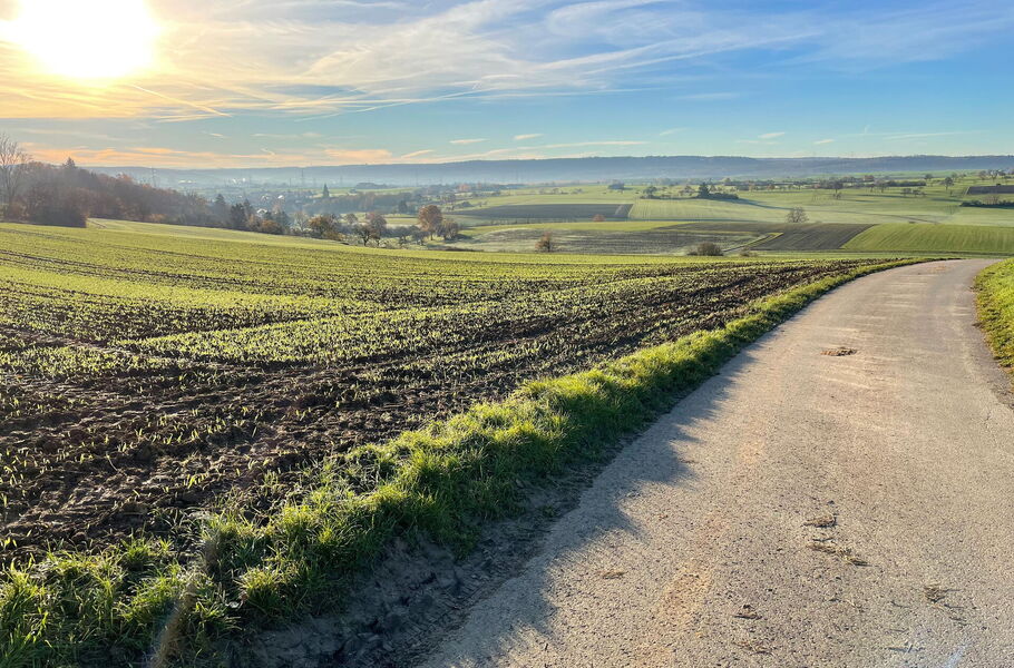 Meine Alternativstrecke führt mich durch Rutesheim und über ebenfalls fast autofreie Wirtschaftswege hoch über die Felder und durch Wälder. Diese Strecke ist mit rund 360 Höhenmetern recht anspruchsvoll aber noch einsamer und schöner.