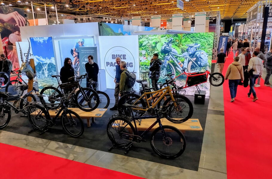 velotraum präsentierte zusammen mit seinem Fachhandelspartner Bikepacking Belgium Räder aus dem Reiserad-Segment. Inhaber und Geschäftsführer Axel Keller hatte zwei velotraum-Ausstellungsräder im Gepäck: eine Neuentwicklung, nämlich den gelben ROOTER mit Trapez-Rahmen (R700) und einen braunen ROOTER mit 28-Zoll-Laufrädern und 29er-Bereifung. Letzteres ist ebenfalls eine Neuheit bei velotraum, denn bekannterweise setzen wir mehrheitlich auf 27.5-Zoll-Laufräder. Die 29er werden zukünftig am ROOTER für die Größen XL, 2XL und 3XL angeboten. Das sorgt für eine harmonischere Optik bei großen Rahmen und für mehr Laufruhe, besonders auf der Straße.